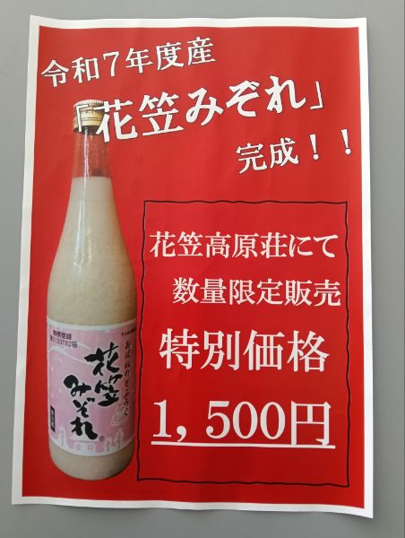 どぶろく「花笠みぞれ」の販売を開始しました! 公開済み: 2025年12月18日更新: 2025年12月18日作成者: masterカテゴリー: どぶろく「花笠みぞれ」の販売を開始しました。 数量限定、特別価格1,500円です。(=御所山1,500m) 花笠高原荘フロントにて販売しています。