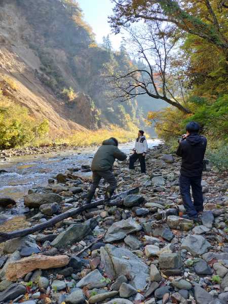 10月30日(木)、絶好の撮影日和となり「箕輪権現」付近の道元峡は紅葉の真っ盛り、フィリピン出身のチーフディレクターのユイさんは、渓谷美と紅葉の美しさに感激していました。